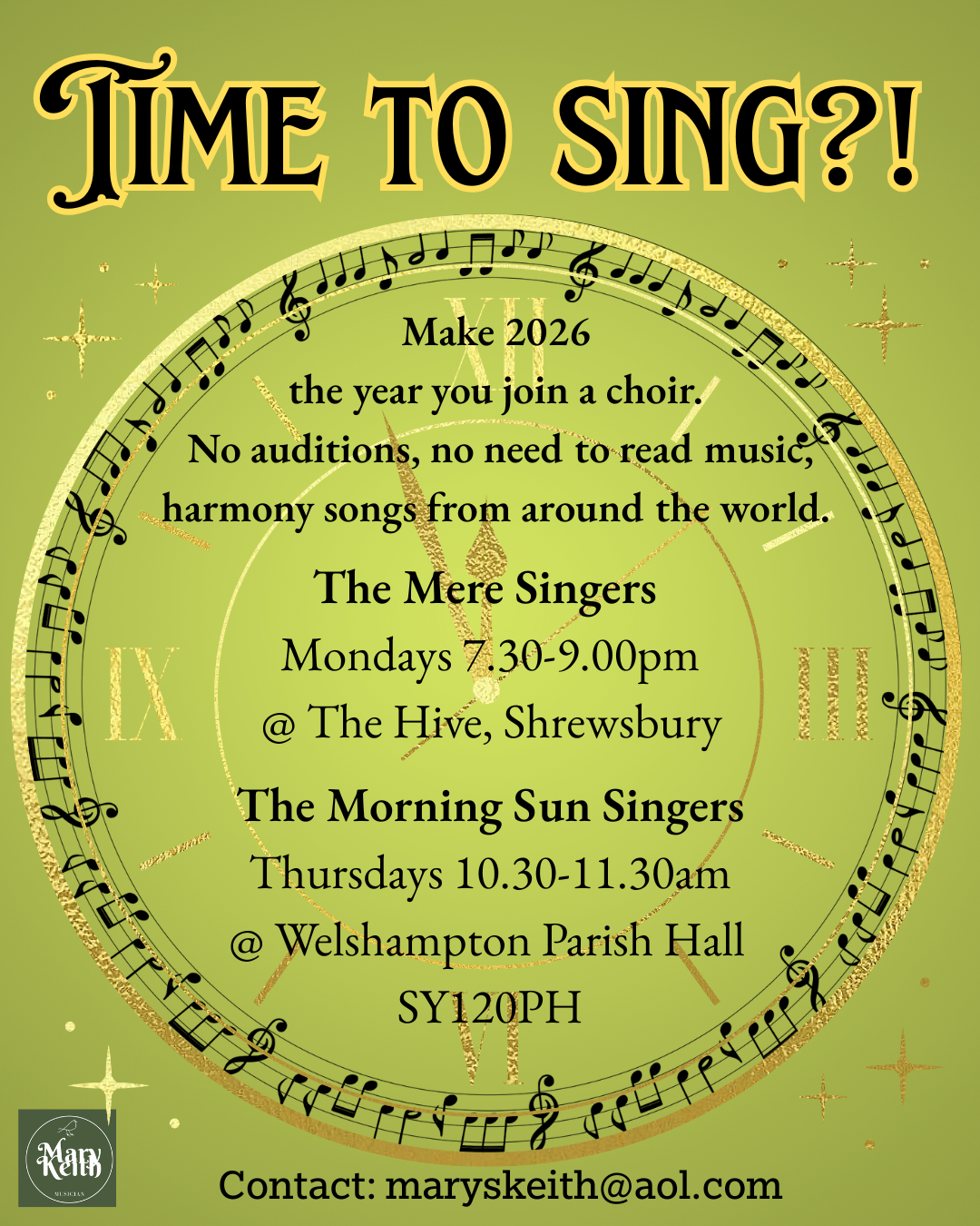 Monday 12th January: Mere Singers term starts, 7.30-9.00 at The Hive Shrewsbury.